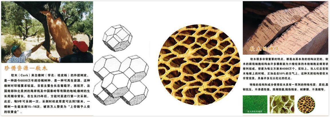 軟木具有獨(dú)特的細(xì)胞結(jié)構(gòu):它由六面體棱柱狀的死細(xì)胞呈網(wǎng)狀組成,每個(gè)細(xì)胞是相互獨(dú)立的而且細(xì)胞內(nèi)充有90%的空氣。